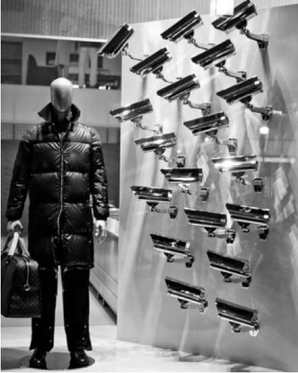 A priori, rien ne laisse présager des possibles relations entre l’univers de la séduction et celui de la vidéosurveillance. En 2008, les vitrines internationales des magasins Louis Vuitton ont pourtant intégré une politique de design intégrant des éléments caractéristiques de ces dispositifs de contrôleVoir la vitrine des magasins Louis Vuitton : vêtements (2008).↩︎. Il était alors possible d’admirer une multitude de caméras de surveillance braquées sur le modèle exposé. Le consommateur-voyeur observant les caméras était ainsi engagé dans un jeu de regard désignant en abyme ce qu’il était censé acheter, la vitrine exposant la démarche de séduction de la marque tout en soulignant la valeur de l’objet mis sous haute surveillanceVoir la vitrine des magasins Louis Vuitton : accessoires (2008).↩︎.