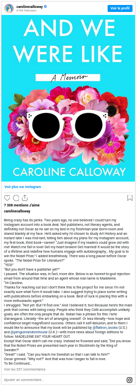 Pour le chercheur Philippe Lejeune, l’autobiographie est un « récit rétrospectif en prose qu’une personne réelle fait de sa propre existence lorsqu’elle met l’accent sur sa vie individuelle, en particulier, sur l’histoire de sa personnalité » (1975, 14). Et c’est bien à un tel travail que se livre la jeune femme, même son récit paraît souvent empreint d’une certaine préciosité qui se manifeste par exemple dans des tournures au passé simple – les réseaux sociaux favorisent une écriture au présent – ou dans l’affectation de ses dialogues, un format loin d’être usuel sur Instagram, ou encore dans sa gestion de la temporalité. En effet, Calloway effectue parfois des prolepses, anticipant sur des événements à venir (« Oscar me dira plus tard qu’il est tombé amoureux de moi la première fois qu’il m’a vue dans ma combinaison-pyjamaVoir une publication Instagram de Calloway illustrant son usage de la prolepse.↩︎ »).