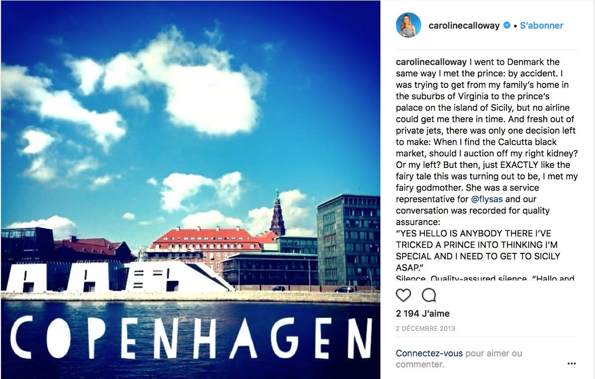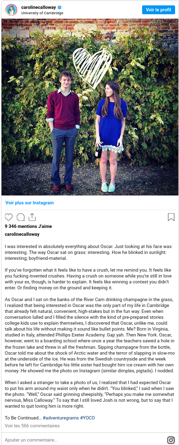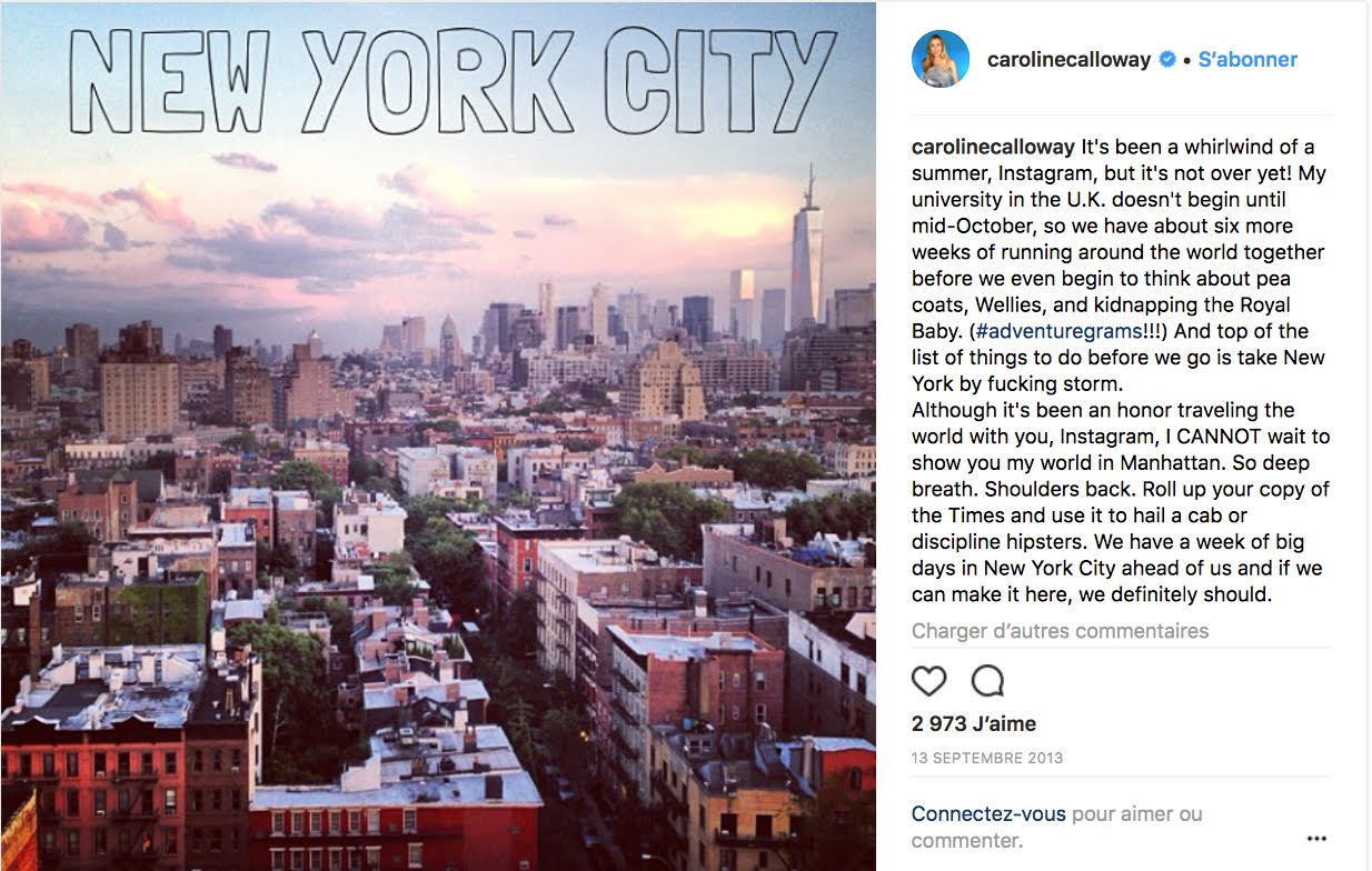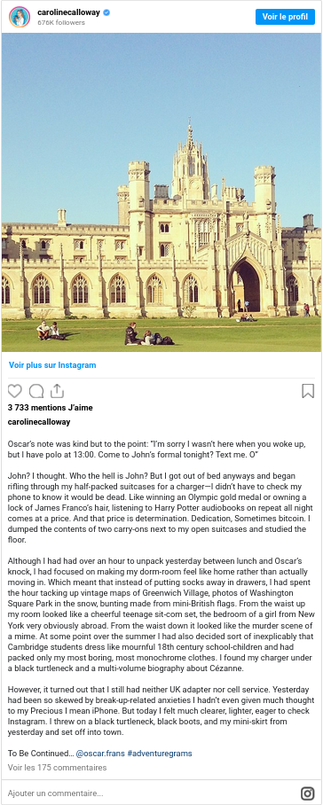 Caroline Calloway est une Américaine d’une vingtaine d’années qui publie le récit de ses aventures sur les réseaux sociaux depuis juin 2012. Son lectorat a dépassé petit à petit le cercle de ses relations pour atteindre aujourd’hui plus de 608 000 abonnés sur InstagramConsulter le compte Instagram de Caroline Calloway.↩︎ – son réseau de prédilection, 53 600 sur TwitterAccéder au compte Twitter de Caroline Calloway.↩︎ et 50 700 sur FacebookConsulter la page Facebook de Caroline Calloway.↩︎Chiffres en date d’octobre 2016.↩︎. Cette étudiante en histoire de l’art relate son expérience en Angleterre à l’Université de Cambridge. Il s’agit pour elle de raconter « l’histoire de sa vie », celle d’une jeune Américaine face aux déboires universitaires, aux rencontres amicales festives et aux tumultes amoureux propres à ce moment de bascule vers l’âge adulte. Sous le hashtag « #adventuregrams », Calloway documente donc sa vie. Son approche médiatique est hybride : chacun de ses messages sur Instagram est constitué d’une image et d’un texte qui, s’il reste court, atteint tout de même souvent la limite de caractères imposée par le site. Photographies d’elle-même, de ses amis, paysages des lieux qu’elle a visités, de ses repas : ses images comme ses textes dépeignent une vie qui semble avant tout tenir du conte de fées. À ce titre, son petit ami Oscar, jeune et séduisant étudiant suédois, fait indubitablement figure de prince charmant…